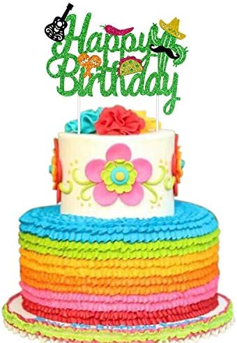 Amazon Com Feliz Cumpleanos Cake Topper Red Green Glitter Mexican Happy Birthday Spanish Chilli Guitar Fiesta Theme Party Decors Supplies Grocery Gourmet Food